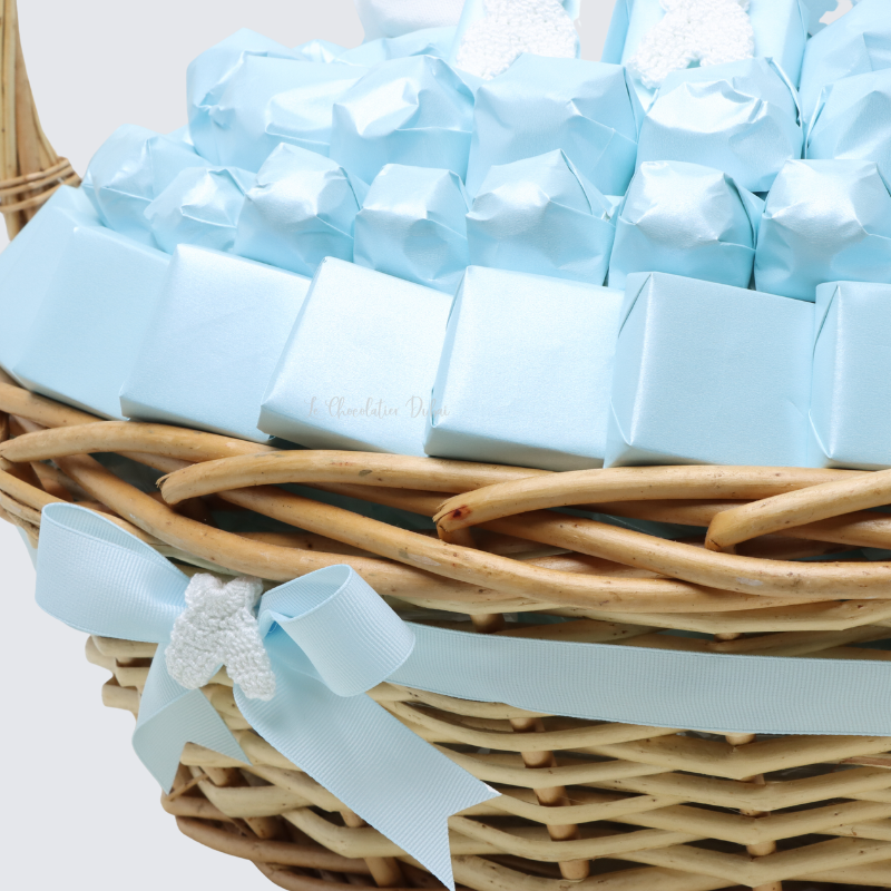Baby boy decorated chocolate medium basketBBARN216Our chocolate is sold in milk, dark and white chocolate with assorted fillings, with 80% of the quantity in milk...