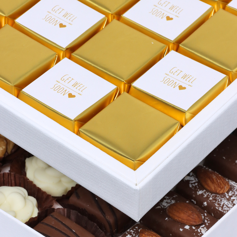 Get well soon gold designed 2-layer...GWS12Our chocolate is sold in milk, dark and white chocolate with assorted fillings, with 80% of the quantity in milk...