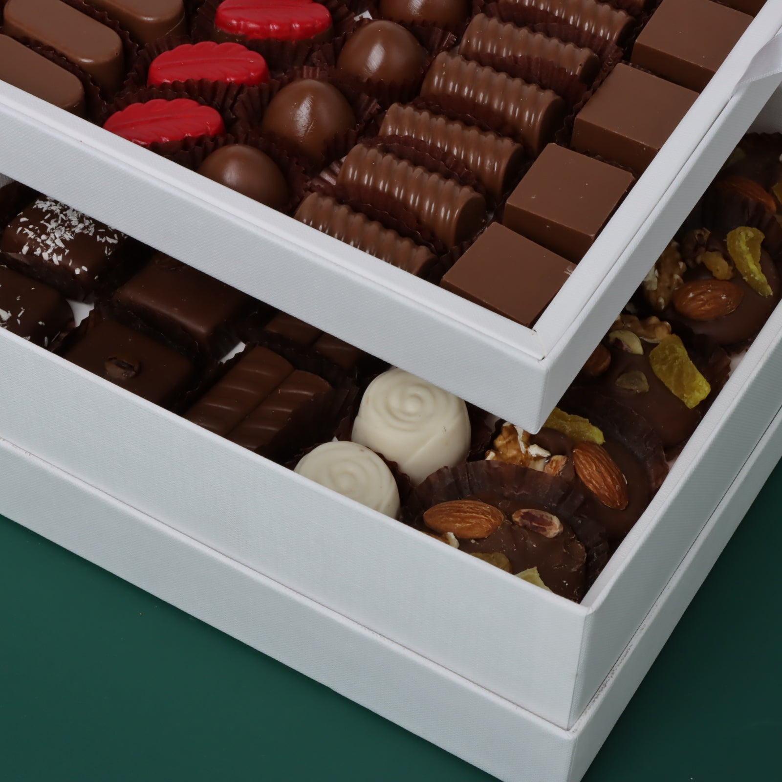 Our chocolate is sold in milk, dark and white chocolate with assorted fillings, with 80% of the quantity in milk chocolate normally.