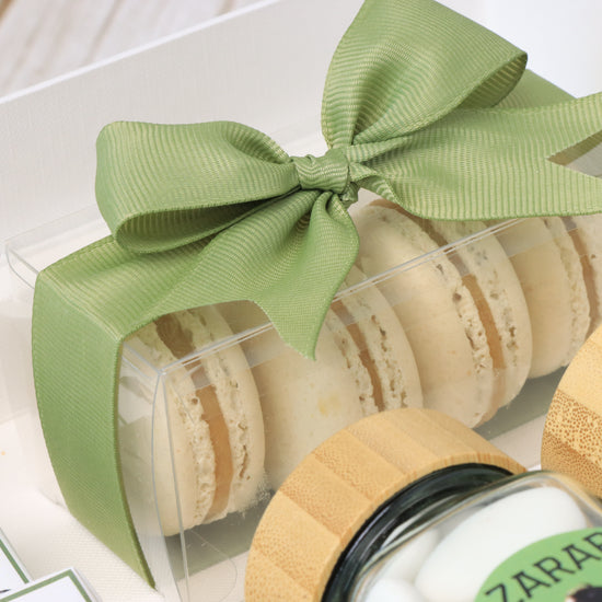 240 grams (12 pieces) premium printed wrapped chocolate, 75 grams almond dragees, 75 grams almond chocolate coated, 4 pieces macaroon