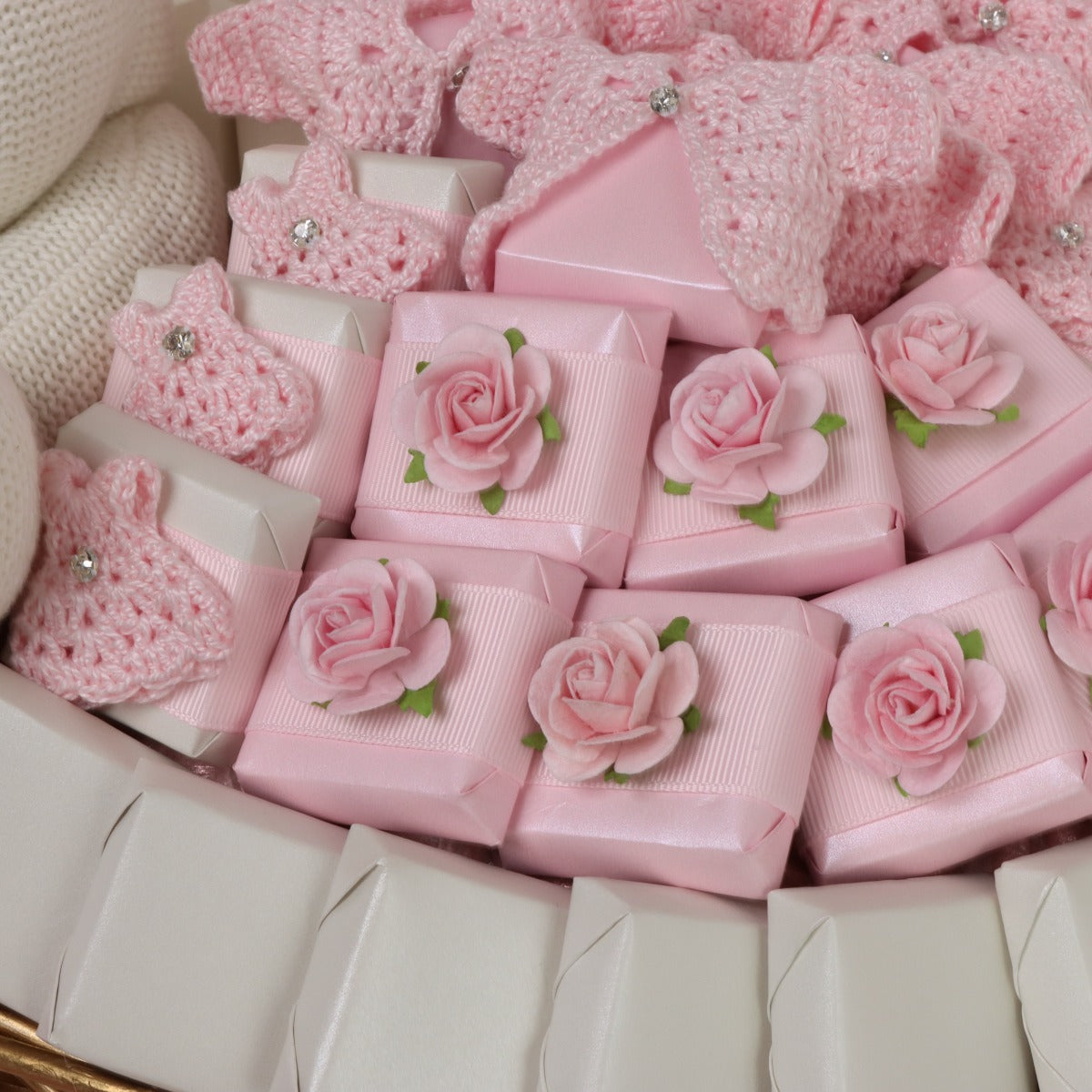 Approximately 900 grams premium chocolate (24 pieces solid wrapped, 10 pieces decorated wrapped, 6 pieces crochet dress decorated wrapped, 5 pieces crochet jacket decorated chocolate)