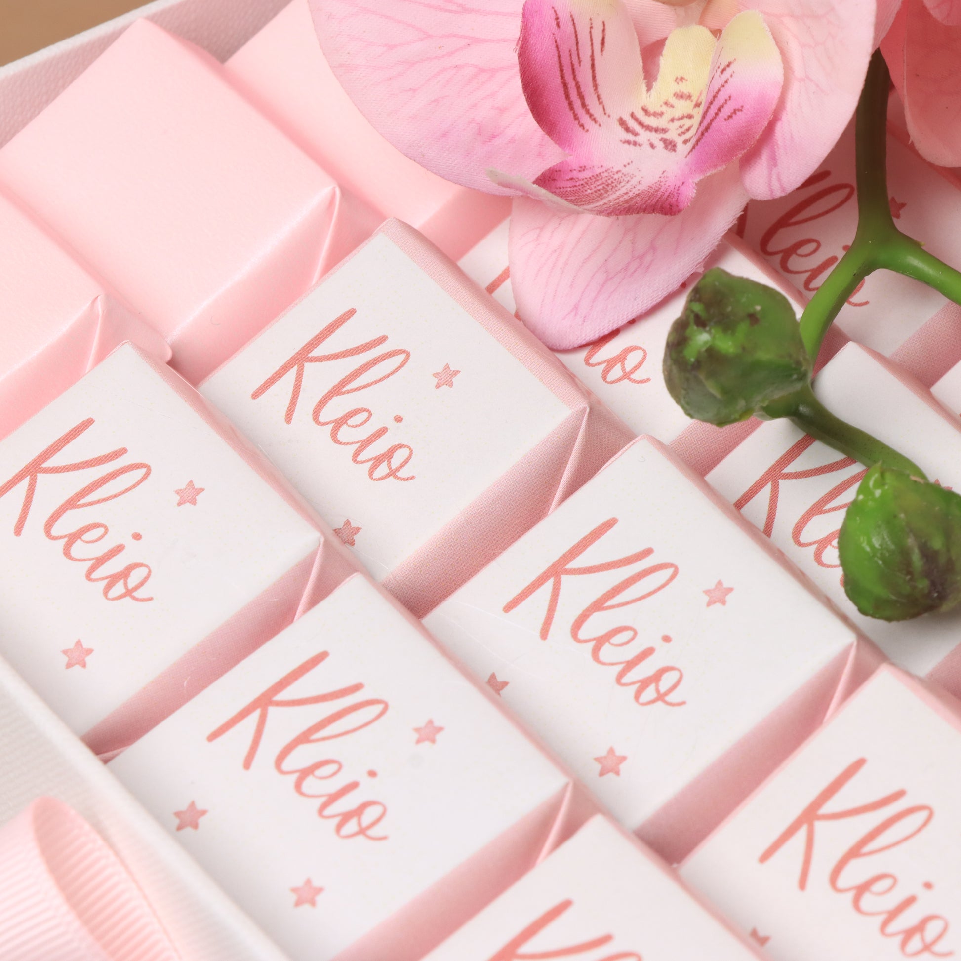 Approximately 900 grams premium chocolate (25 pieces printed wrapped, 26 pieces solid wrapped) 200 grams almond dragees