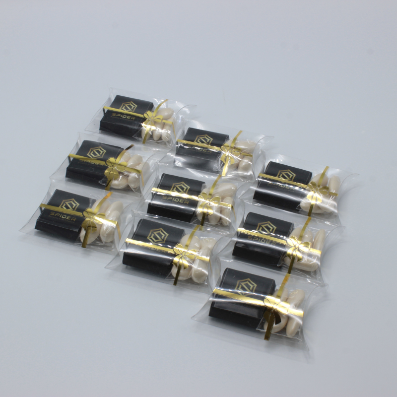 1 piece branded wrapped premium chocolate, 4 pieces almond dragees