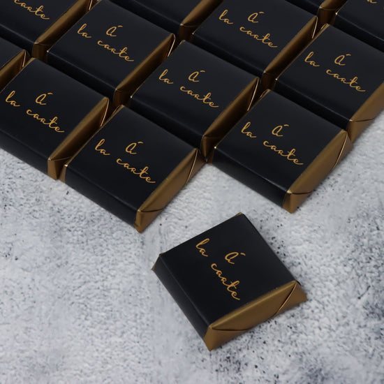 Branded chocolate is sold by kilo in assorted flavours. 50 pieces are 1 kg. The chocolate is 4.5 x 4.5 cm and weighs 20 grams per piece. The price is 430 per kg. The minimum order is 1 kg. The price is only for loose chocolate and excludes boxes, hampers, trays, or baskets, which are at an additional cost.