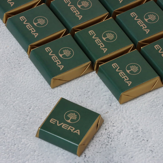Branded chocolate is sold by kilo in assorted flavours. 50 pieces are 1 kg. The chocolate is 4.5 x 4.5 cm and weighs 20 grams per piece. The price is 430 per kg. The minimum order is 1 kg. The price is only for loose chocolate and excludes boxes, hampers, trays, or baskets, which are at an additional cost.