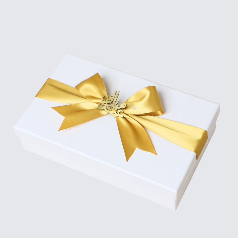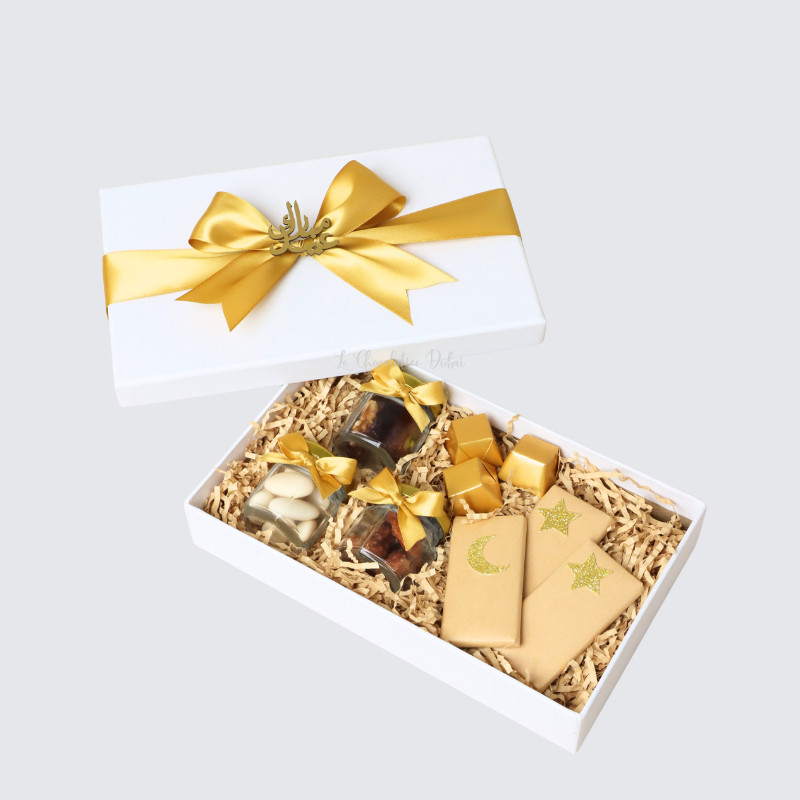 120 grams (6 pieces) premium chocolate (3 pieces designed wrapped, 3 pieces solid wrapped) 1 small jar almond dragees (40 grams) 2 pieces premium nut stuffed dates 1 small jar caramelized nuts (40 grams)