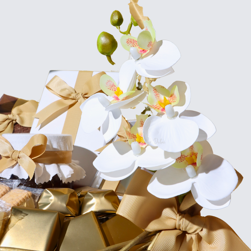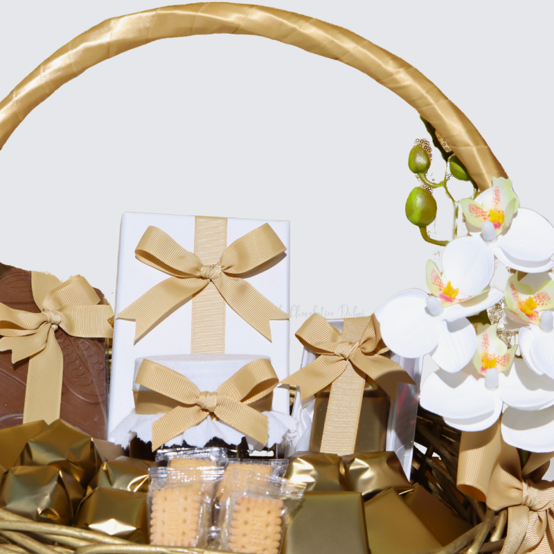 Flower decorated chocolate and delights and honey jar basketFlower decorated chocolate and delights and honey jar basketFlower decorated chocolate and delights and honey jar basket