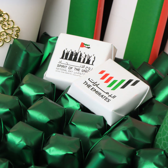 Approximately 1.14 kg (4 pieces printed wrapped, 70 pieces solid wrapped), 3 pieces knafeh pistachio bar, 200 grams almond dragees, 4 pieces turkish delights, 4 pieces crunchies, 20 pieces luxury mixed stuffed dates