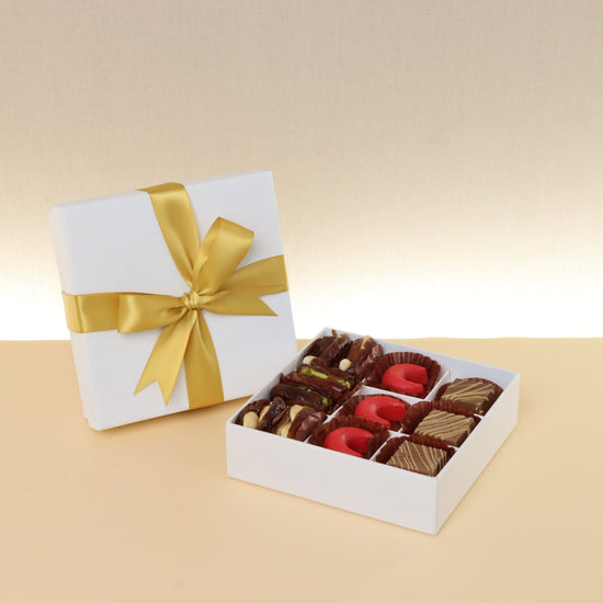 Premium chocolate & dates 9-pc hard box with gold ribbonPremium chocolate & dates 9-pc hard box with gold ribbonPremium chocolate & dates 9-pc hard box with gold ribbonPremium chocolate & dates 9-pc hard box with gold ribbon