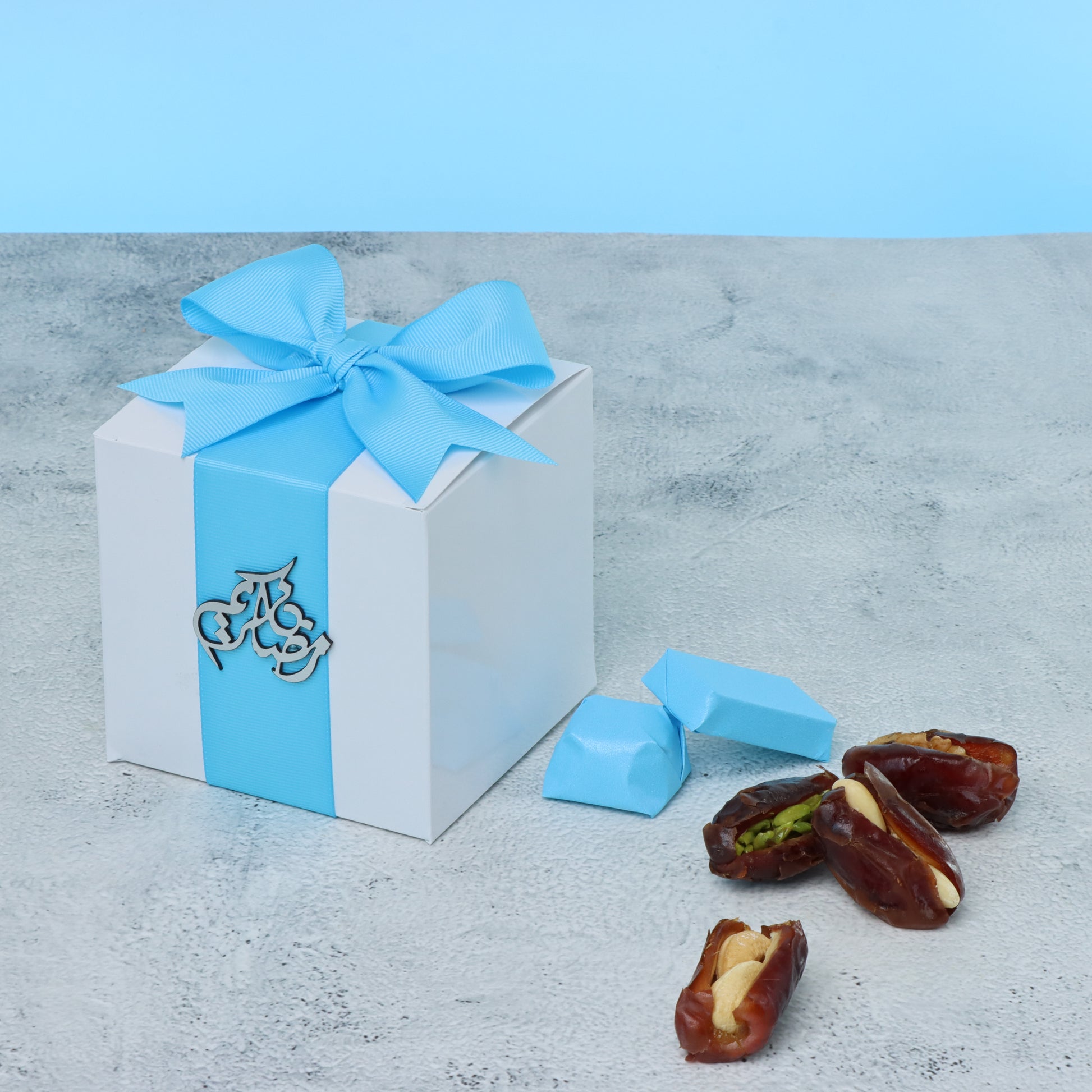 2 pieces solid wrapped premium chocolate, 4 pieces premium nut stuffed dates