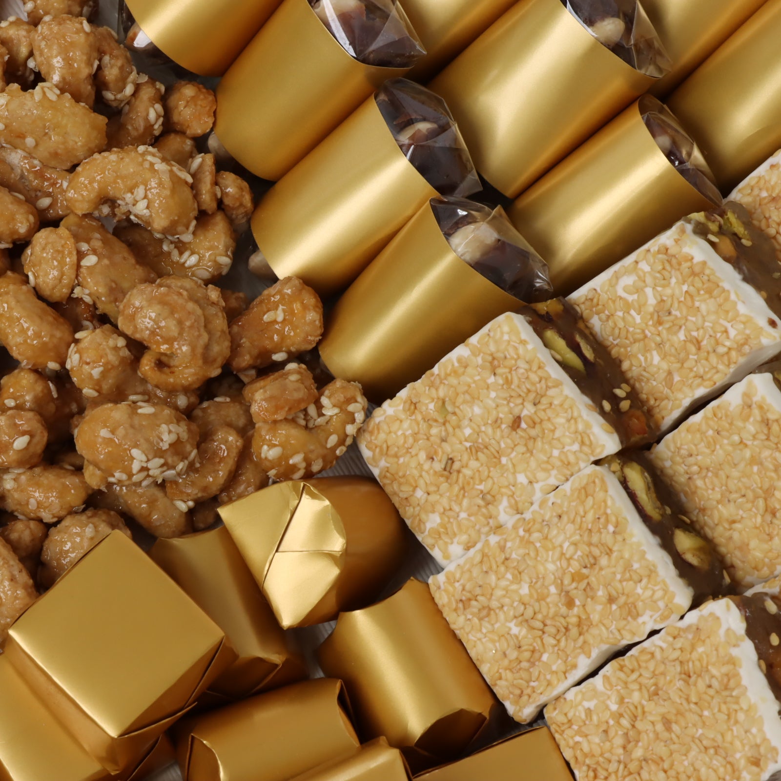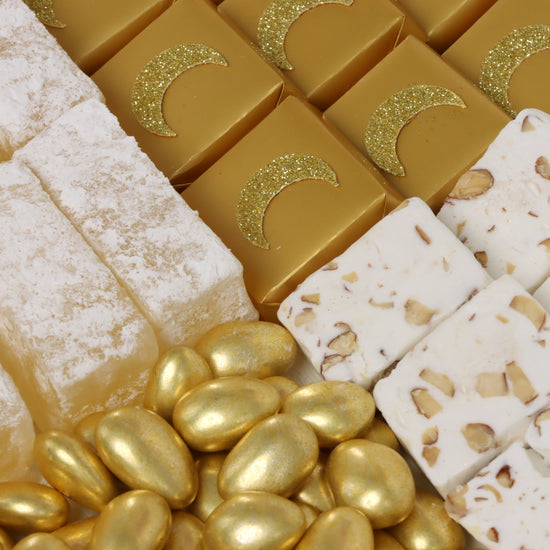 23 pieces premium chocolate, 18 pieces malban delights ,8 pieces halkoom sweet, 15 pieces premium nut stuffed dates, 200 grams almond dragees, 200 grams caramelized nuts