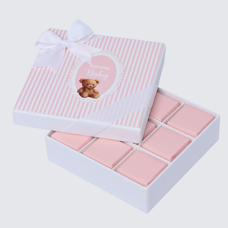 Welcome baby girl teddy designed 9-piece chocolate hard boxWelcome baby girl teddy designed 9-piece chocolate hard box